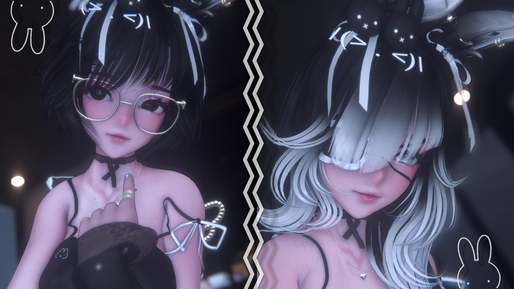 Body - Head - Eyes tex - Hairs - Heels - Glasses - Rings - BODYSUIT - Skirt - Bunny Ears - bunny tail - (miffy set pouty kitti kawaii paper ribbon eyepatch) - Clothes.